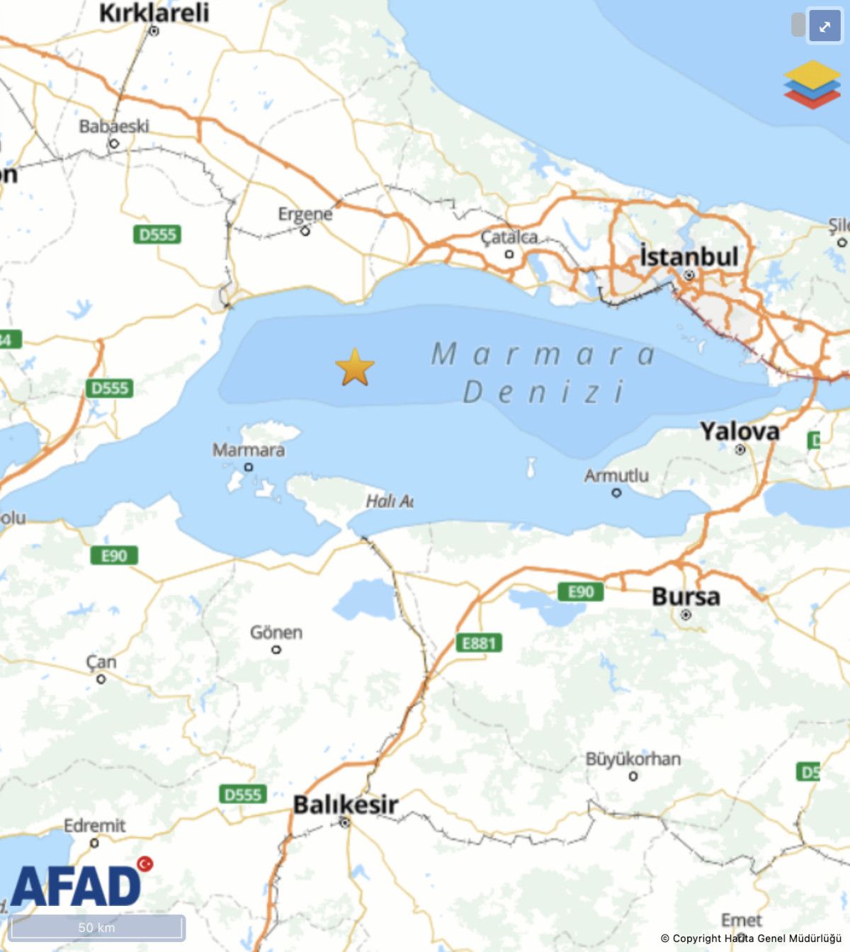 AFAD'dan yapılan açıklamaya göre deprem Marmara Denizi'nde 5.0 büyüklüğünde gerçekleşti.